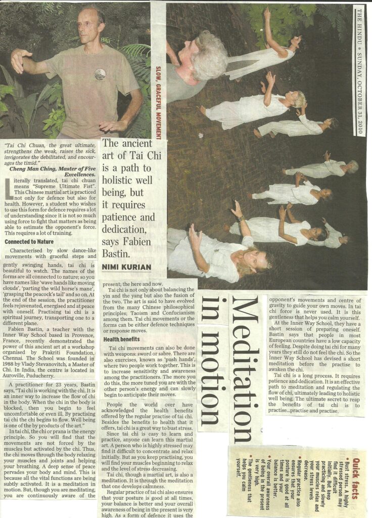 The original vision of Auroville invites its residents to work collectively toward a more conscious society while cultivating an individual psychic and physical inner search, applied within the framework of work and other outward activities. Aware that the Taï Chi approach through the «Inner Way» of the School — and in particular its intensive work with the Chi — would be an excellent tool for the development of the future city, Mauna set out to make this practice widely known by creating a network of about ten different locations within Auroville in order to share whatshe had learned.