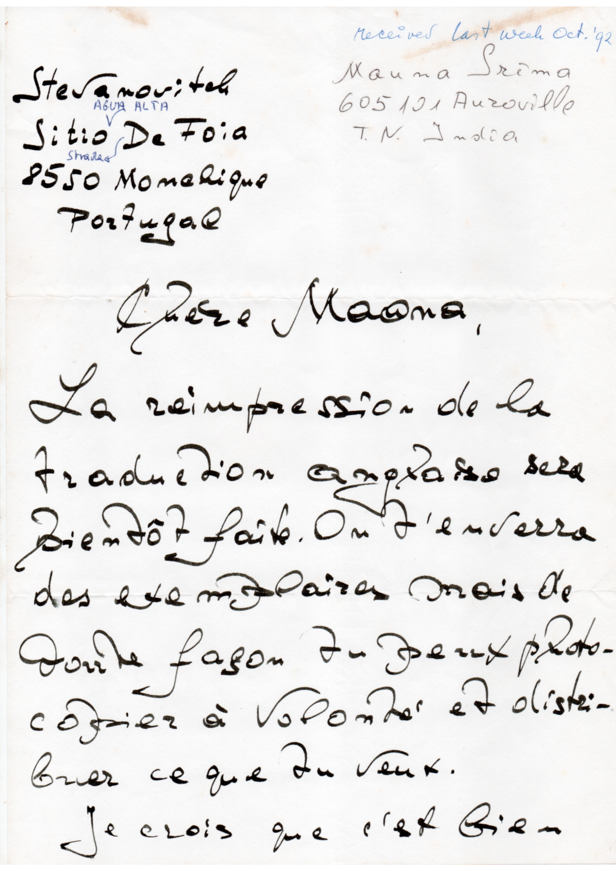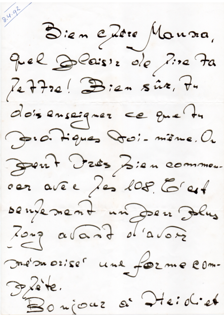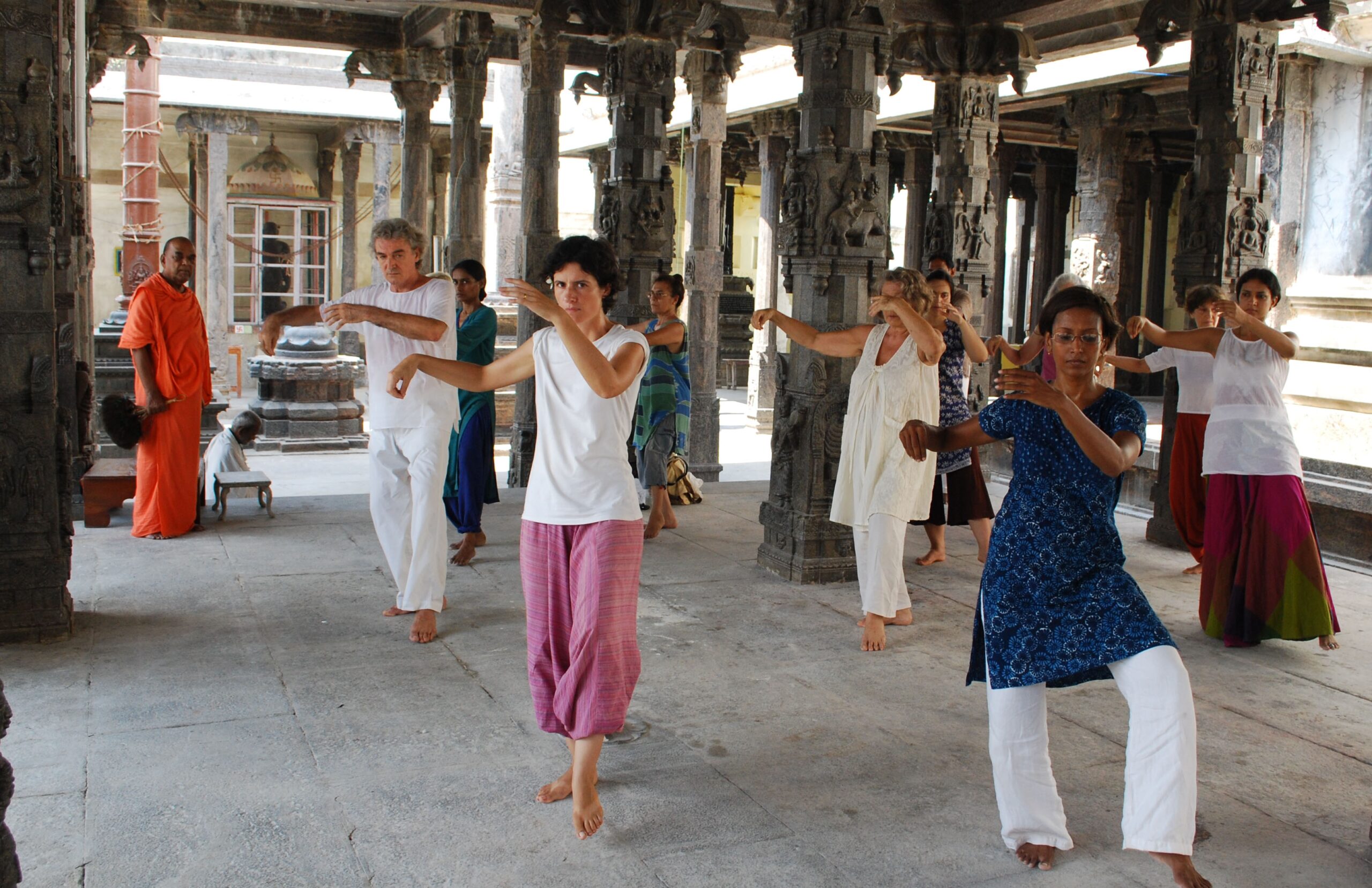 Later, Mauna, a Dutch pioneer who had settled in Auroville in its very first year, joined the school’s teachings for eleven months in centers across Portugal, France, Belgium, and Switzerland, often hitchhiking from one place to another, with a list of the 108 postures tucked in her pocket. Encouraged by Vlady, who named her a Monitor, she began to share the art with her community in India in June 1992.